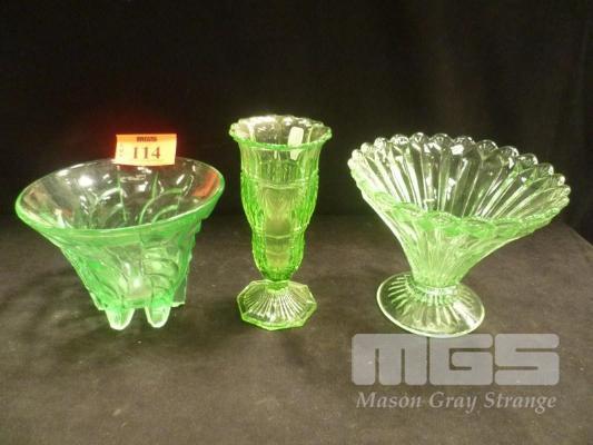 3 x URANIUM GLASS VASES, 12, 14 & 17cm (H)