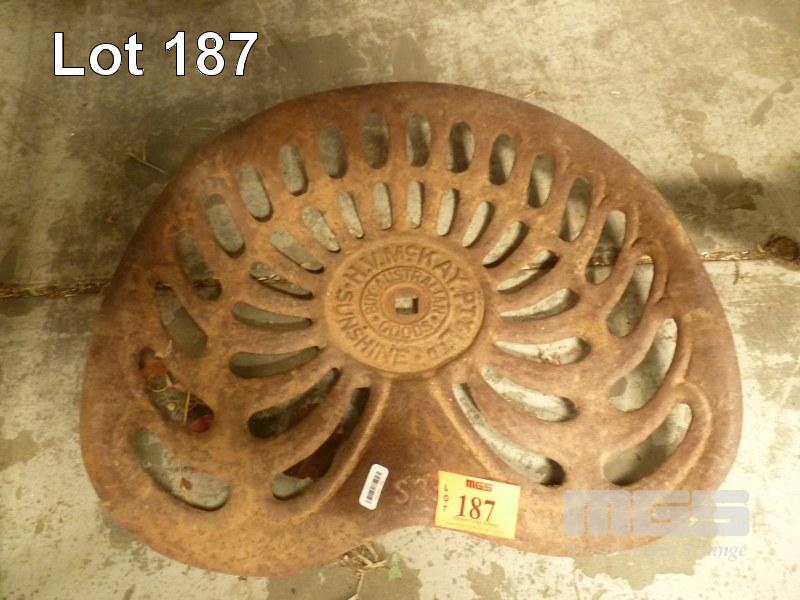 VINTAGE FARM IMPLEMENT SEAT, "SUNSHINE, H.V. MCKAY PTY LTD, BUY AUSTRALIAN GOODS"