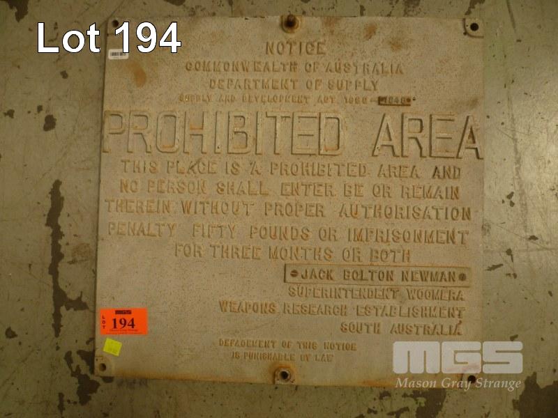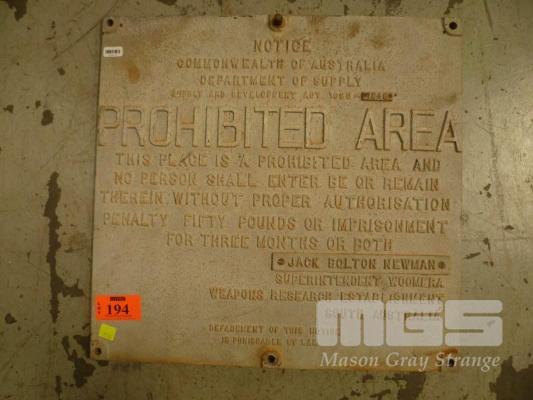 CAST ALUMINIUM SIGN, "PROHIBITED AREA ", 45.5 x 44cm
