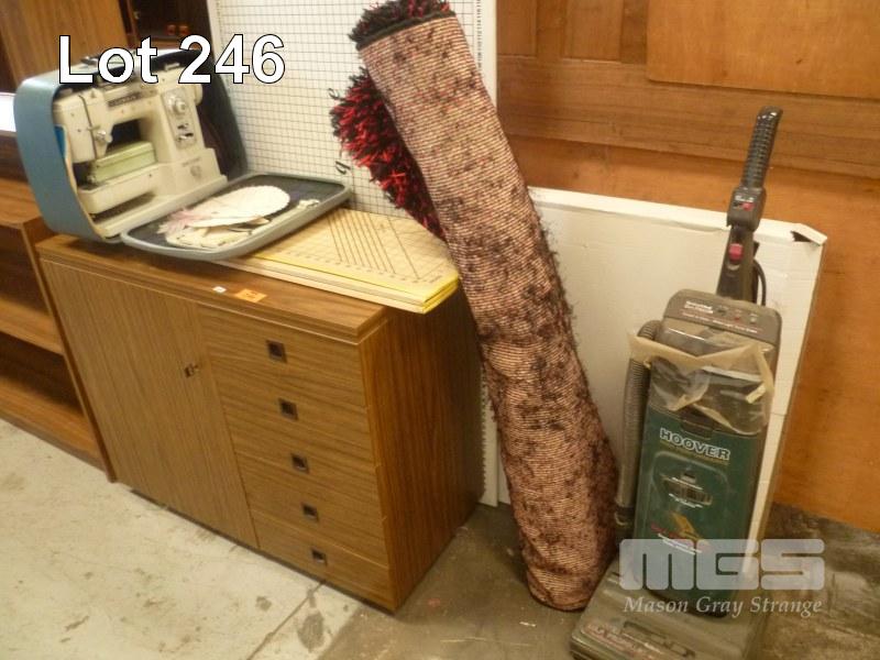 LEMAIR DELUXE SEWING MACHINE, HORN SEWING CABINET, SEWING ACCESSORIES & FLOOR RUG, RED/BLACK ACRYLIC, 133 x 190cm