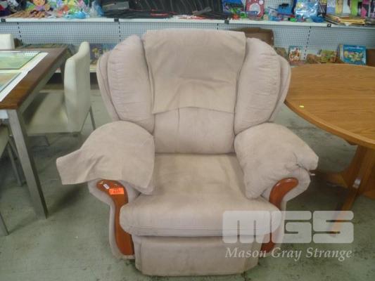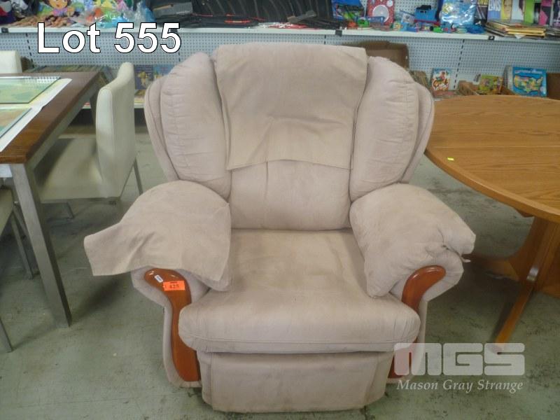 PINK MICROFIBRE RECLINER, POLISHED TIMBER INLAYS