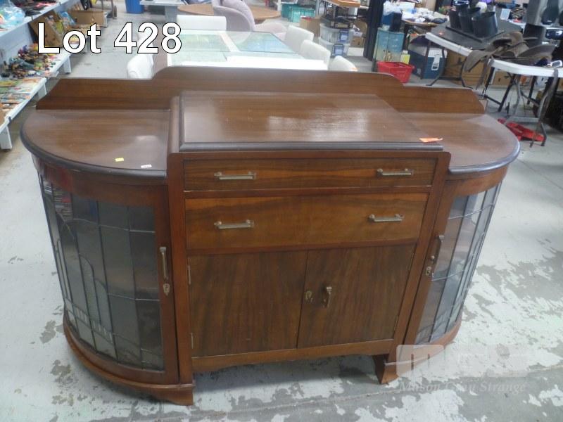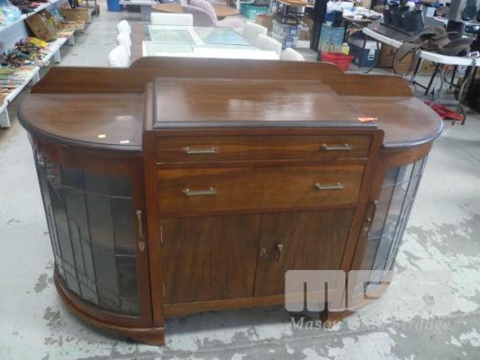 ART DECO, TIMBER SIDEBOARD, CURVED LEADLIGHT GLASS DOORS