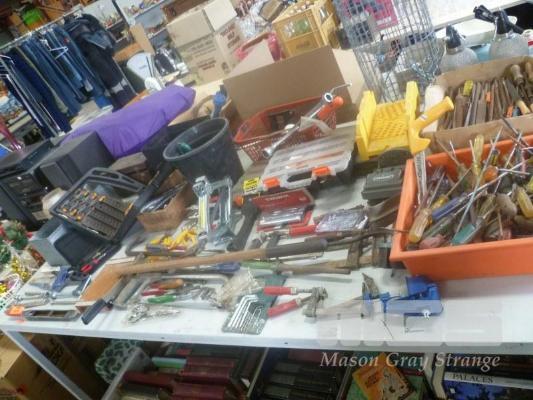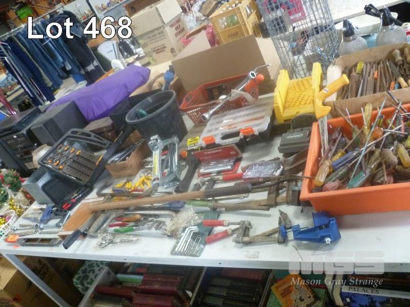 ASSORTED WORKSHOP TOOLS, SPANNERS, CLAMPS, JACK, PLIERS, SCREWDRIVER SET, 2 x GRAB KITS, ETC, 1 x TABLE
