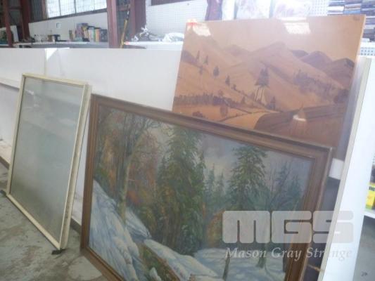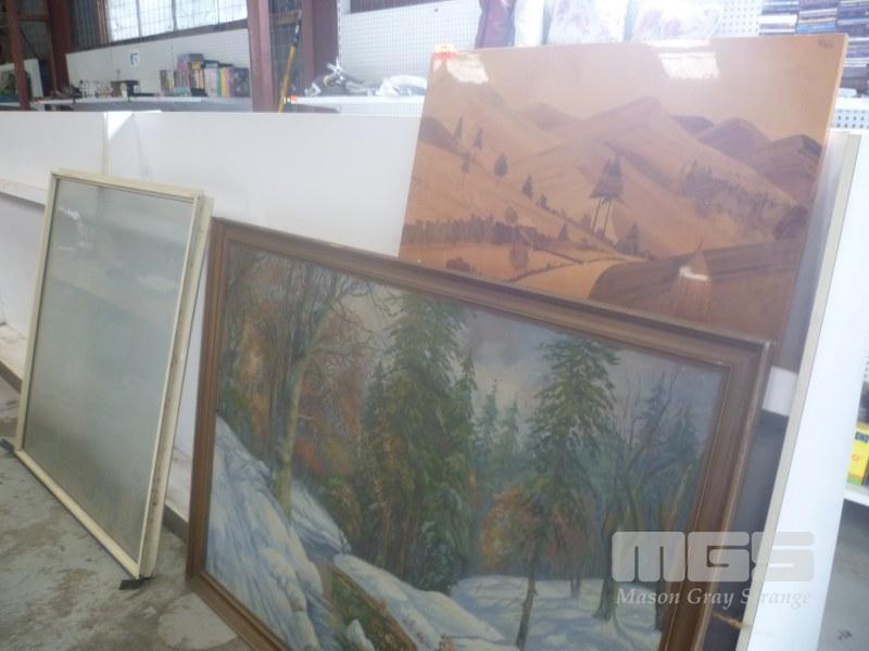 LACQUERED, BLOCK MOUNT TIMBER INLAY WALL ART, FRAMED PAINTING BY HB KASTER & ALUMINIUM FRAMED WINDOW, 121 X 125cm