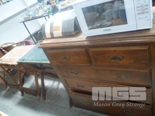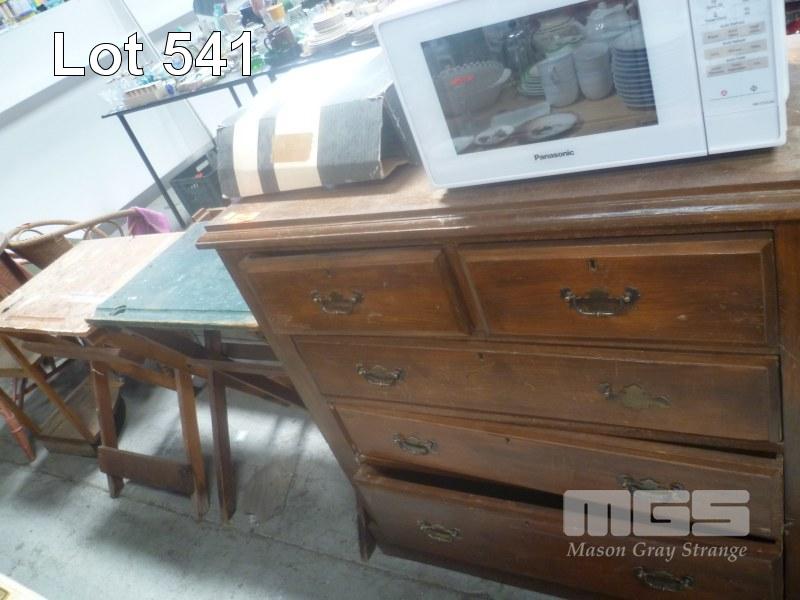 TIMBER TALLBOY, MICROWAVE & 2 X VINTAGE SCHOOL ROOM DESKS
