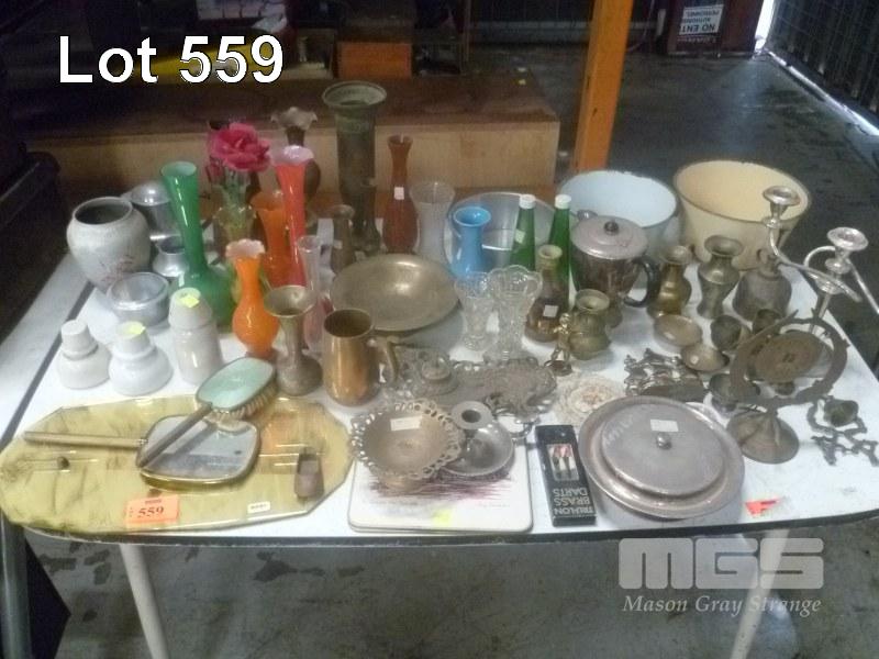 ASSORTED EPNS, BRASSWARE, COLOURED GLASS VASES, ETC, 1 x TABLE