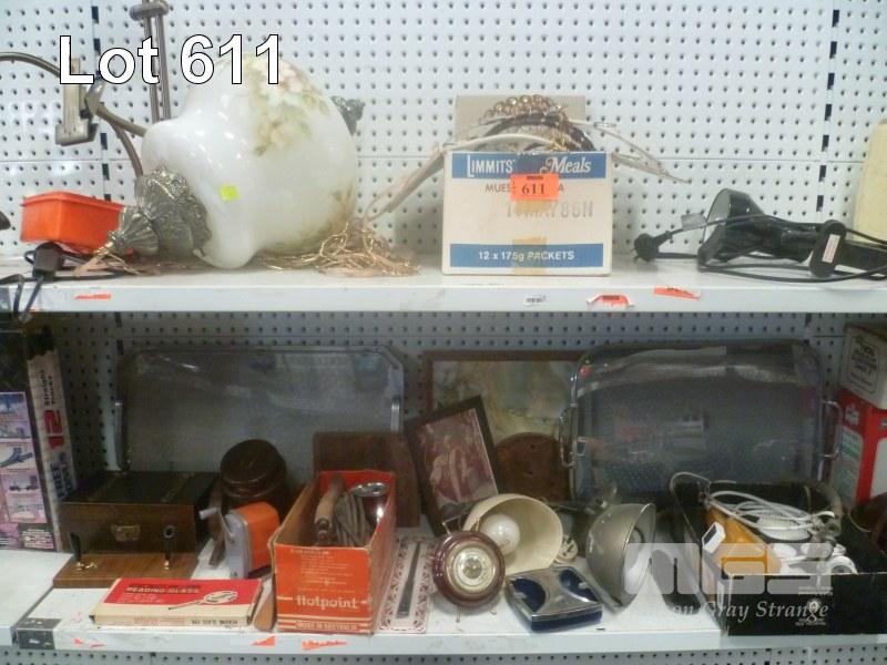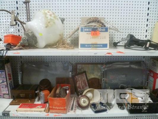 MID CENTURY ITEMS INC DRINKS TRAYS, HOTPOINT IRON, LAMPS, CEILING LIGHT, ETC, 2 x SHELVES