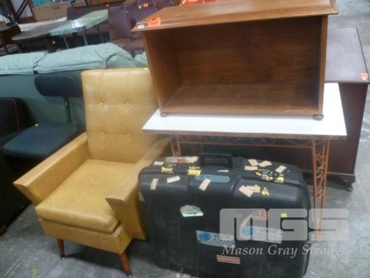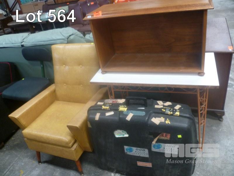 WROUGHT IRON FRAME TABLE, TIMBER UNIT, MUSTARD VINYL ART DECO ARM CHAIR, RETRO OFFICE CHAIR & SOLID SUITCASE