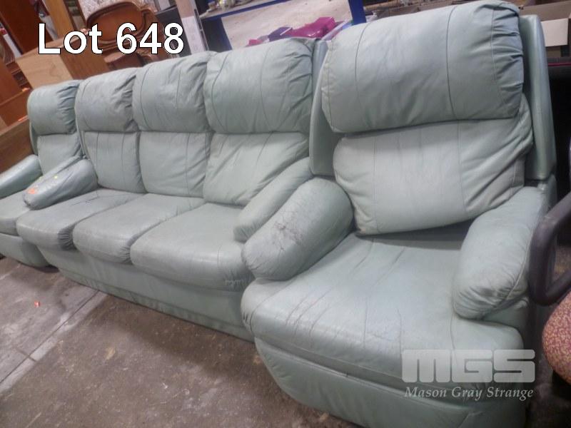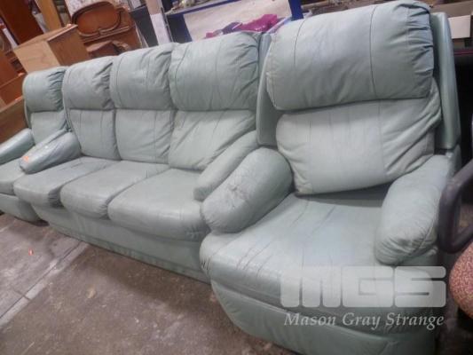 GREEN LEATHER 3 PIECE LOUNGE SUITE INC 3 SEATER, ALL FAULTS, CUSHION TORN & 2 x SINGLES