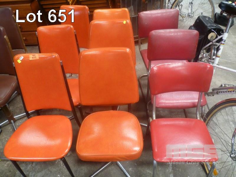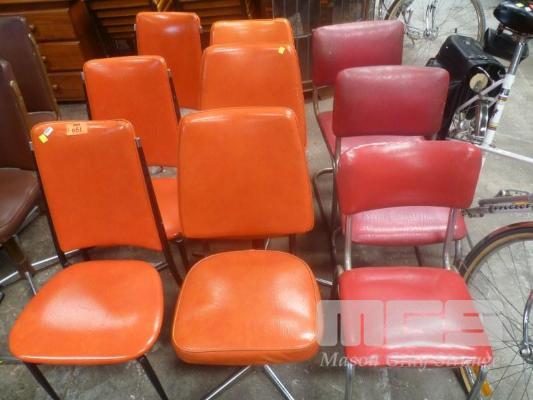 ASSORTED RETRO DINING CHAIRS INC SET 3 ORANGE VINYL, 2 x SWIVEL BASE, ORANGE VINYL, 1 x ORANGE VINYL METAL FRAME, 2 x SKID BASE, RED VINYL & 1 x RED VINYL, CHROME FRAME