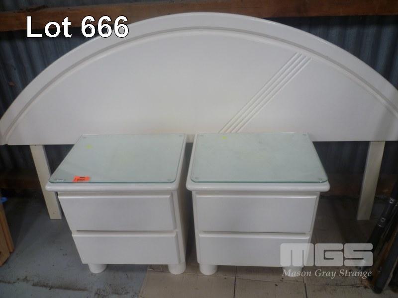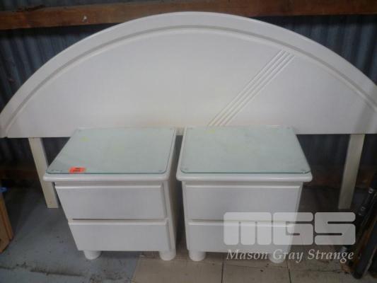 PAIR OFF WHITE, GLOSS BEDSIDE CABINETS WITH MATCHING QUEEN SIZE BEDHEAD