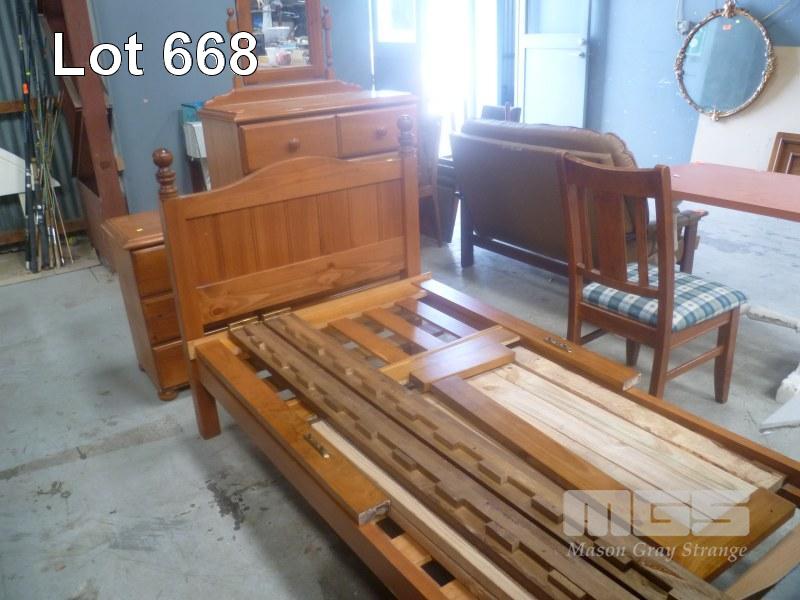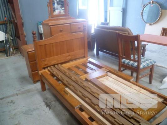 PINE 4 PIECE BEDROOM SUITE INC 5 DRAWER TALLBOY, BEDSIDE CABINET & 2 x TIMBER SLAT SINGLE BEDS