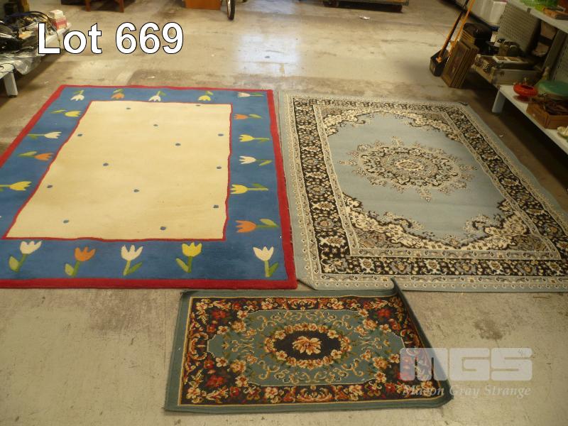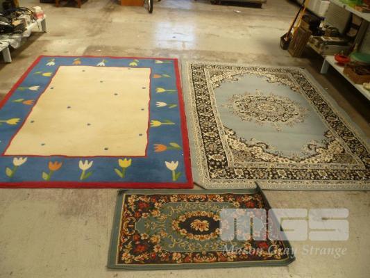 3 x ACRYLIC FLOOR RUGS INC, MULTI COLOUR WITH TULIPS, 224 x 167cm, BLUE/GREY PATTERNED, 226 x 161cm & RED/BLUE/BEIGE PATTERN, 99 x 56cm