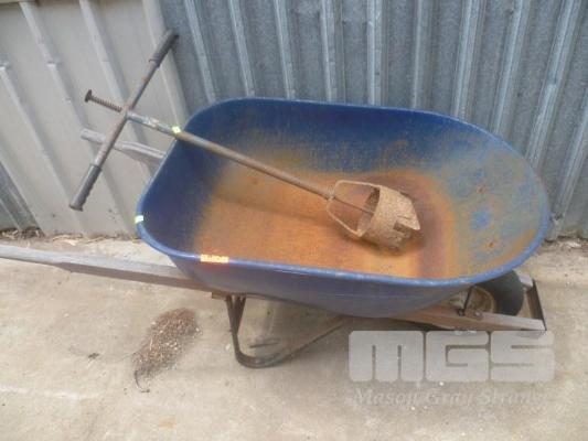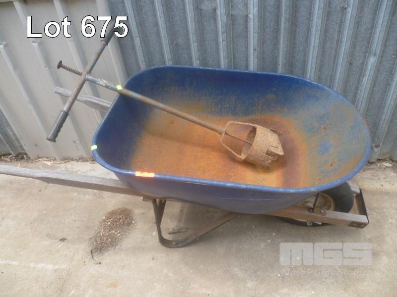BLUE METAL WHEELBARROW & POST HOLE DIGGER