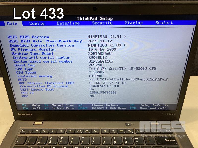 LAPTOP, LENOVO THINKPAD X1 CARBON (20BTA036AU), CORE i5 5300U (5TH GEN) @ 2.3GHz, 8GB DDR3 RAM, 256GB SSD, 14" WIDESCREEN (1920x1080), INTEL HD VIDEO, Wi-Fi, BLUETOOTH, WINDOWS 10 HOME INSTALLED, ONELINK PRO DOCK & POWER SUPPLY (NOTE: MARKS ON SCREEN) S/N:R90GBL1S
