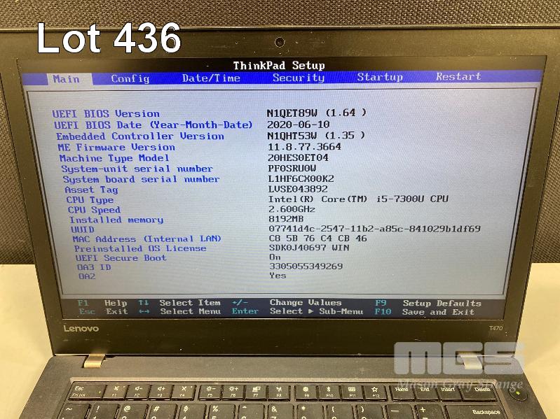LAPTOP, LENOVO THINKPAD T470 (20HES0ET04), CORE i5 7300U (7TH GEN) @ 2.6GHz, 8GB DDR4 RAM, 500GB NVMe M.2 SSD, 14" WIDESCREEN (1366x768), INTEL HD VIDEO, Wi-Fi, BLUETOOTH, WINDOWS 10 PRO INSTALLED & POWER SUPPLY (NOTE: DAMAGE TO CASING, NO BATTERY) S/N:PF0SRU0W