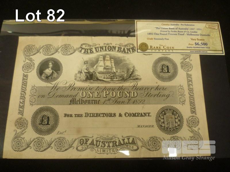 1892 UNION BANK OF AUSTRALIAN 1 POUND NOTE "PRINTERS PROOF" WITH PREVIOUS SALES TAG FOR $6500