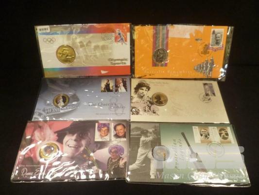 6 X AUSTRALIA POST, COIN STAMP COVERS, INC; 2000 SYDNEY OLYMPICS, SIR DONALD BRADMAN, DAME EDNA EVERAGE, DAME NELLIE MELBA, THE QUEENS BIRTHDAY, AUSTRALIA REMEMBERS