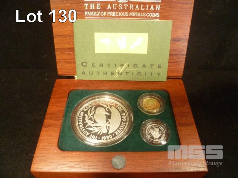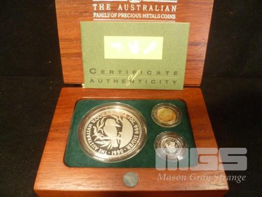 THE PERTH MINT, THE AUSTRALIAN FAMILY OF PRECIOUS METALS COINS, 1990 $5 PROOF SET, KOOKABURRA 1oz SILVER, NUGGET 1/20oz GOLD, KOALA 1/20oz PLATINUM