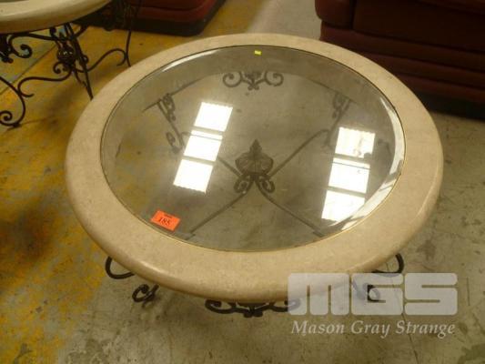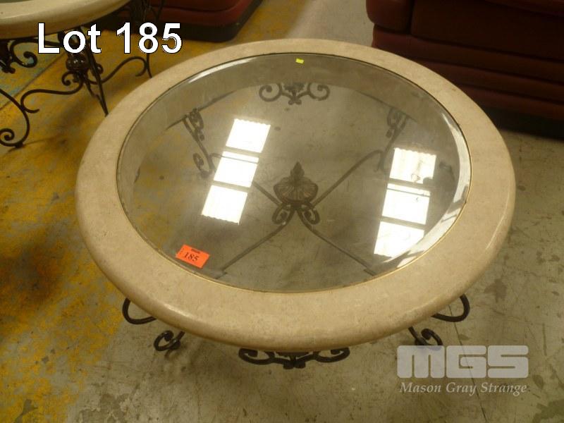 FAUX MARBLE CIRCULAR GLASS TOPPED COFFEE TABLE ON WROUGHT IRON LEGS (DIA. 1,000mm)