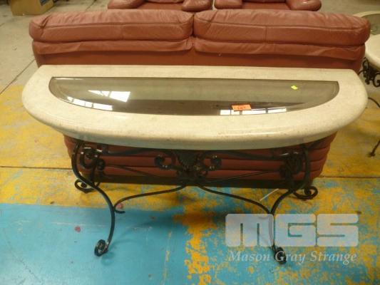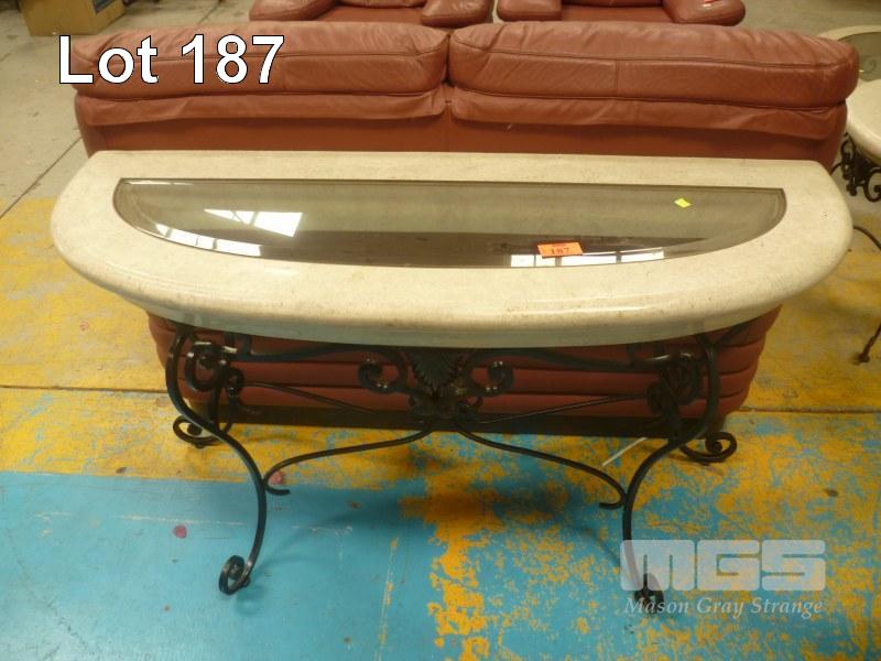 FAUX MARBLE GLASS TOPPED SOFA TABLE ON WROUGHT IRON LEGS (1350mm W x 460mm D x 770 mm H)