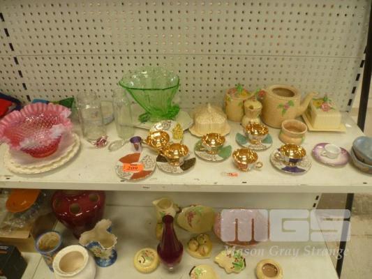 COLLECTION OF ASSORTED CROCKERY AND GLASSWARE INCLUDING VINTAGE INFANT'S MILK BOTTLE AND URANIUM GLASS VASE (1 x SHELF)