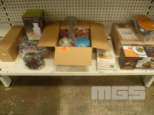 ASSORTED KITCHWARE, INCL STORAGE CONTAINERS, PLATES, RANGE MATE, KNIFE SET, ETC.
