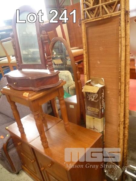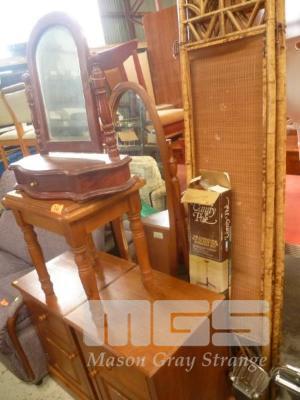 2 x SOLID TIMBER BEDSIDE TABLES, SMALL WOOD SIDE TABLE AND TABLE-TOP VANITY MIRROR WITH SMALL DRAWER.