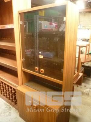 TIMBER LAMINATE WALL UNIT, GLAZED DOORS, 2 x GLASS SHELVES