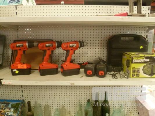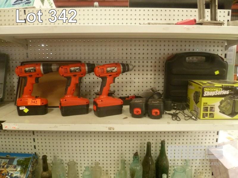 3 x CORDLESS DRILLS, B&D (1 X ALL FAULTS) 2 x CHARGERS & 5 x BATTERIES WITH ROCKWELL MULTI SHARPENER