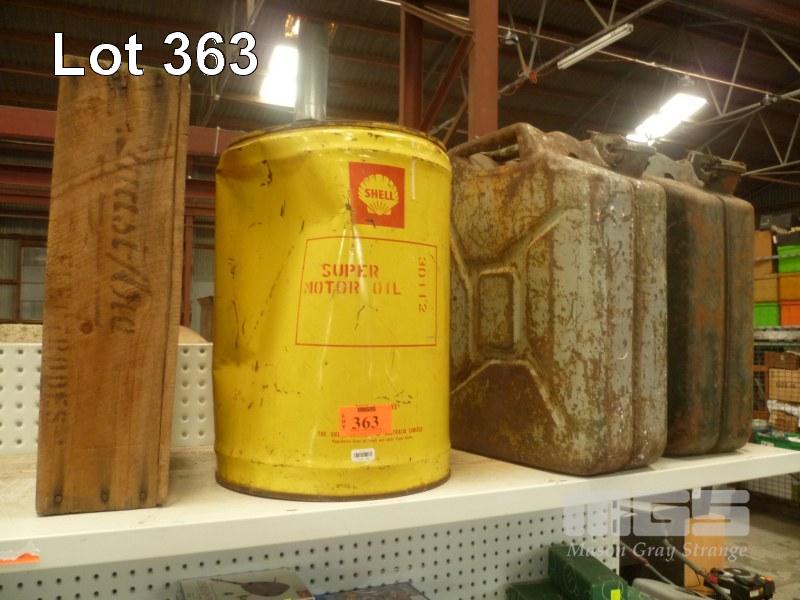 SHELL 5 GALLON IMPERIAL DRUM, 2 x MILITARY JERRY CANS, MARKED 1953 & 1958 & WOODEN BOX