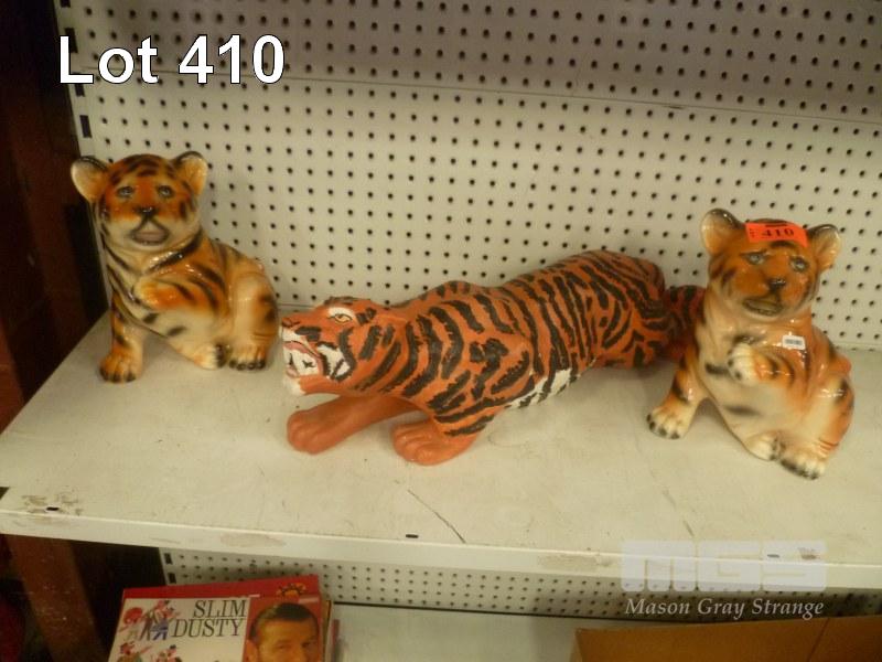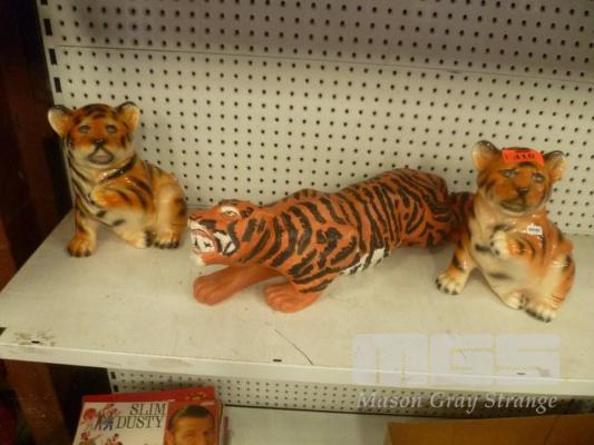 3 x RETRO TIGER STATUES, (2 x SOLID, 1 x PLASTER)