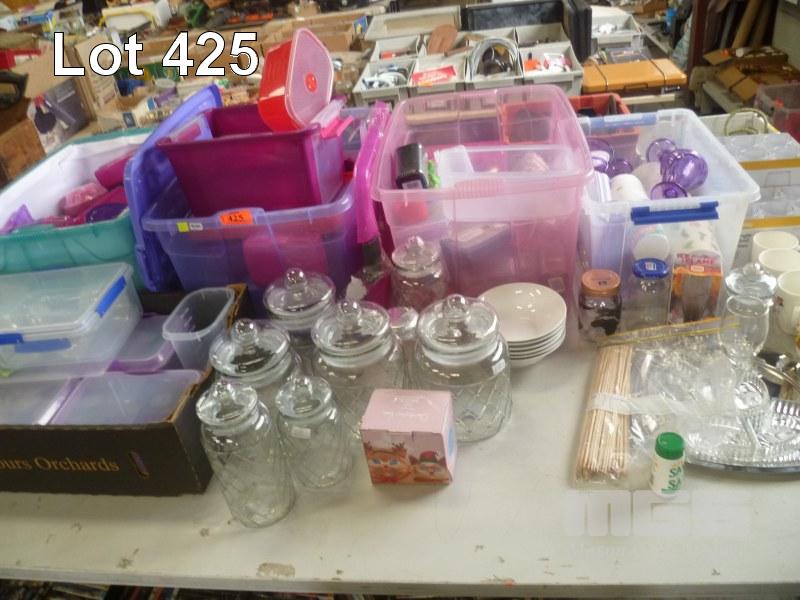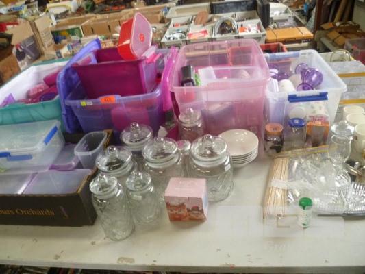 KITCHEN STORAGE CONTAINERS, GLASS JARS, CUPS, ETC, 1 x TABLE