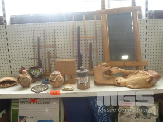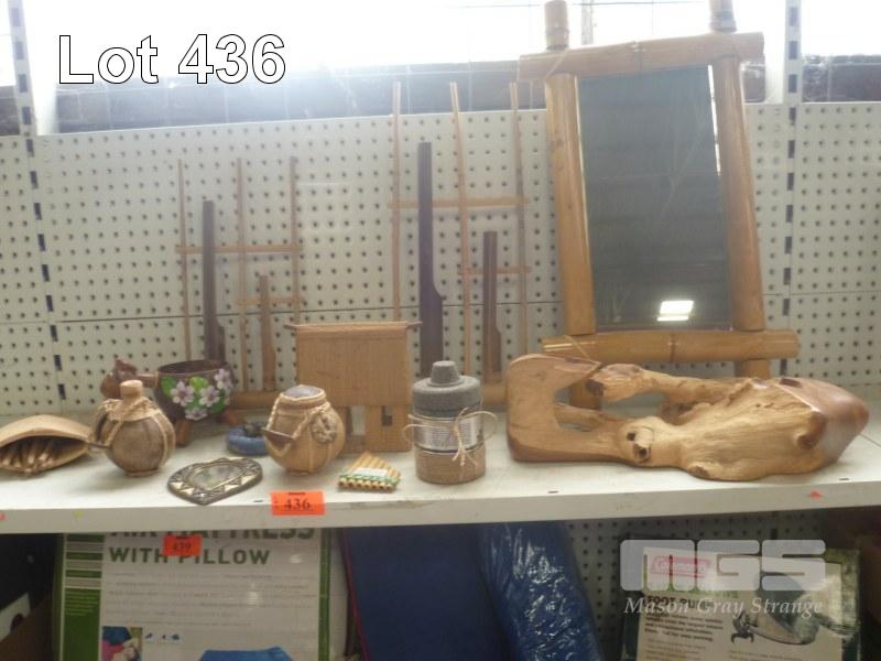 COLLECTION OF WOODEN AND WOVEN CURIOS AND ORNAMENTS.