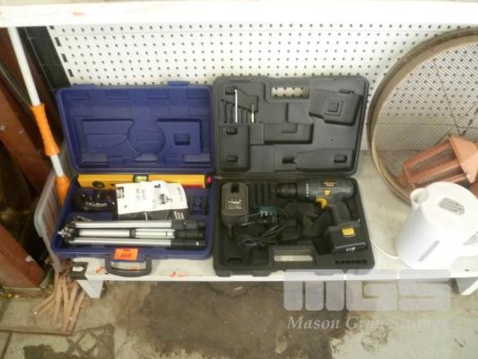 LASER LEVEL, CORDLESS DRILL, KETTLE & VINTAGE GOLD SNIFFER