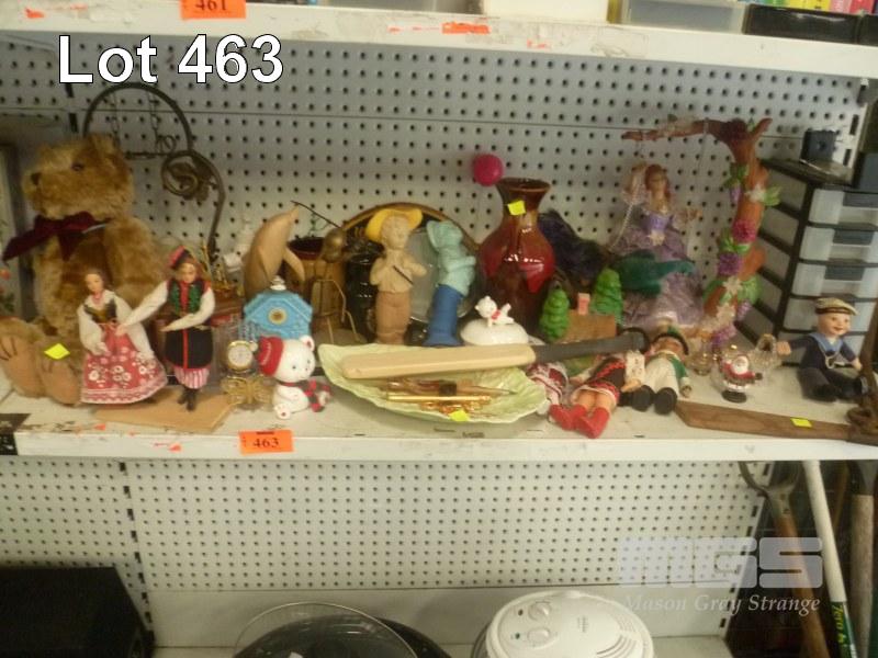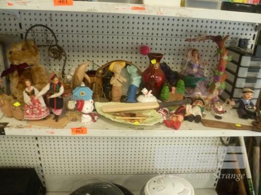 COLLECTION OF HOMEWARES INCLUDING FIGURINES, DOLLS, FRAGRANCE BOTTLES, VINTAGE TOY GUN ETC (1 X SHELF)