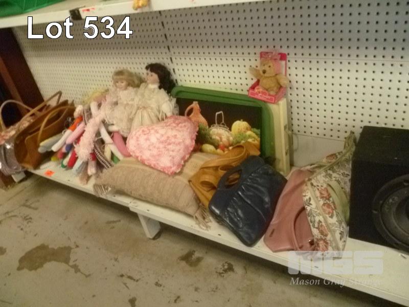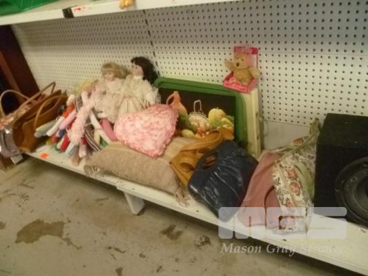 VINTAGE HANDBAGS, CUSHIONS, TRAYS & DOLLS (2 X SHELVES)