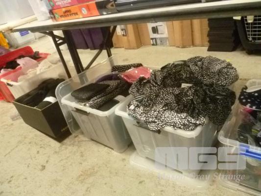 ASSORTED MATERIAL, BEDDING, THROW RUGS, LADIES CLOTHING, ETC, 7 x TUBS