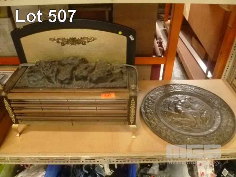 IMITATION LOG, ELECTRIC HEATER & COPPER EMBOSSED WALL ART