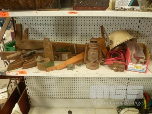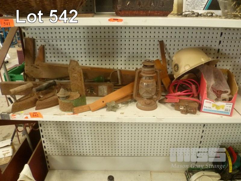 COLLECTION VINTAGE TOOLS, LAMPS, IRONS, LEVELS, ETC