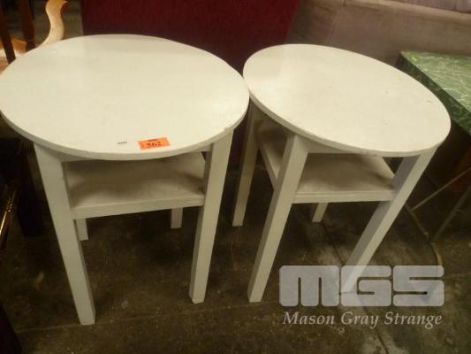 2 x PAINTED ROUND TOP, SINGLE SHELF SIDE TABLE IN WHITE.
