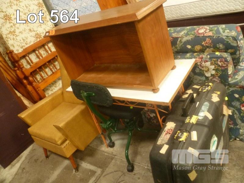 WROUGHT IRON FRAME TABLE, TIMBER UNIT, MUSTARD VINYL ART DECO ARM CHAIR, RETRO OFFICE CHAIR & SOLID SUITCASE