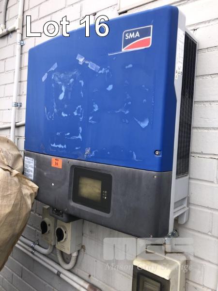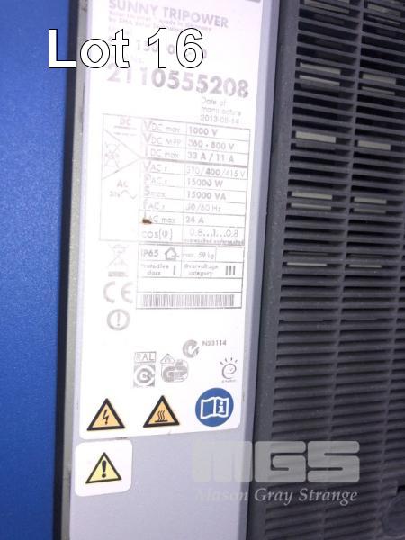 SMA SOLAR INVERTER, 15000w. 1000v DC, 33/11amp DC, VOLTS AC 415, 34amp WITH SOLAR PANELS FITTED TO ROOF NOTE: TO BE REMOVED BY PURCHASER