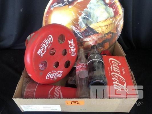 BOX OF VARIOUS COCA-COLA COLLECTABLES, FRISBEE, CHRISTMAS ORNAMENT, 1988 COCA-COLA GLASSES, VINTAGE GLASS BOTTLE COKES, CUPS, YO-YO, TIN BUCKET