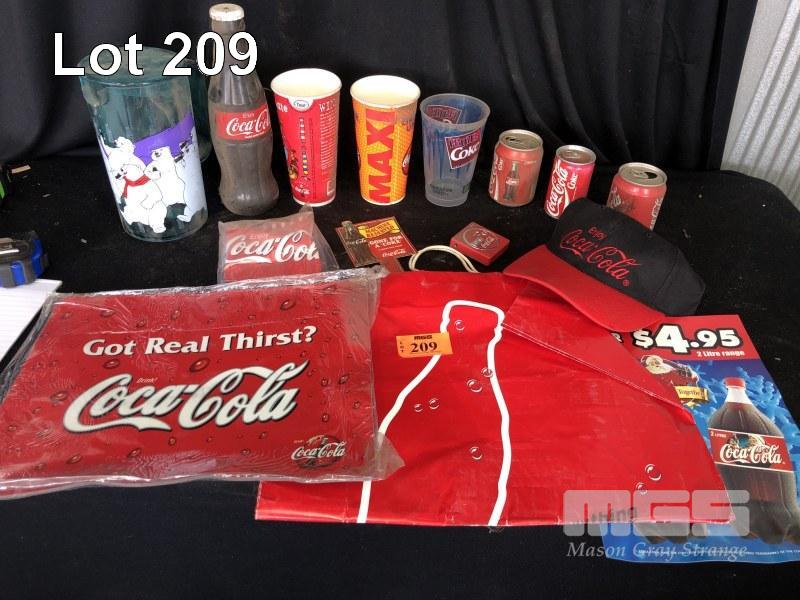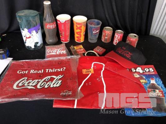 COCA-COLA PLACEMATS, CARRY BAG, CANS, BOTTLE, CUPS, JUG, CAP & SIGN