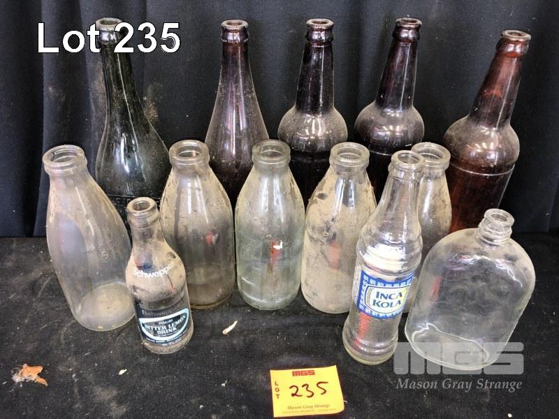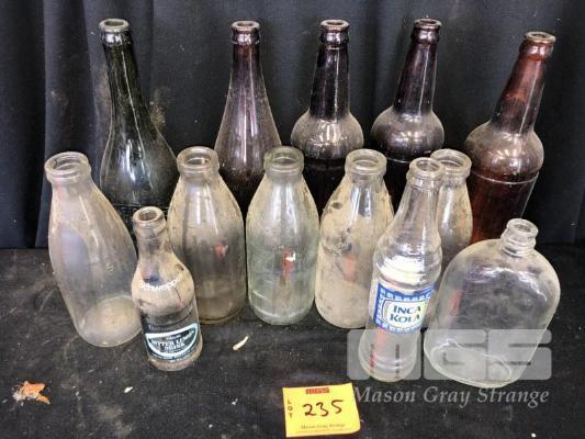 13 x ASSORTED COLLECTABLE BOTTLES, 5 x 1 PINT MILK BOTTLES, 8 x VARIOUS SOFT DRINK & WINE BOTTLES