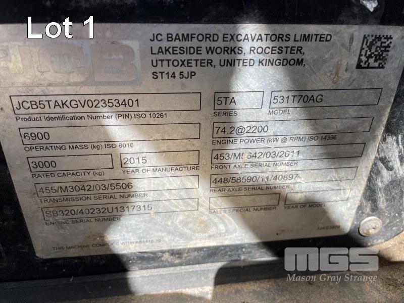 2015 JCB 531-70 AGRI TELESCOPIC HANDLER REG: S91 SBP HOURS: 3,500hours INDICATED S/NO: JCB5TAKGV02353401 HAY & GP FORKS