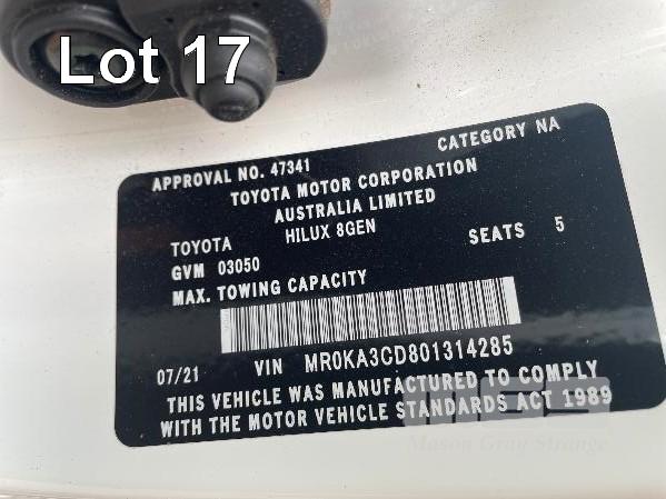 2021 TOYOTA HILIX 8GEN SR DUAL CAB TRAYTOP UTILITY REG: XB 325 L VIN: MR0KA3CD801314285 ODO: 19,000km 2.8L LITRE, AUTOMATIC TRANSMISSION, TURBO DIESEL, STEEL BULL BAR SIDE STEPS PAINTED STEEL TRAY *** NOTE: 19,000 KMS ***