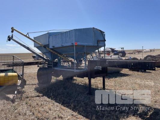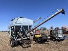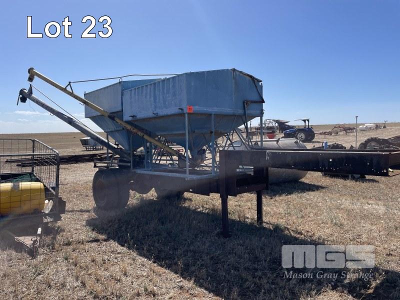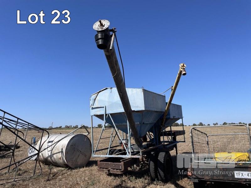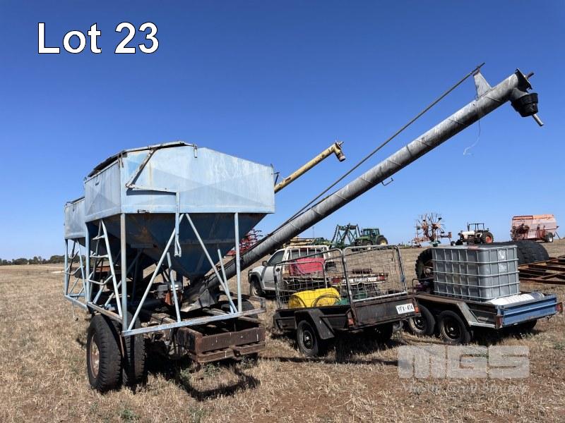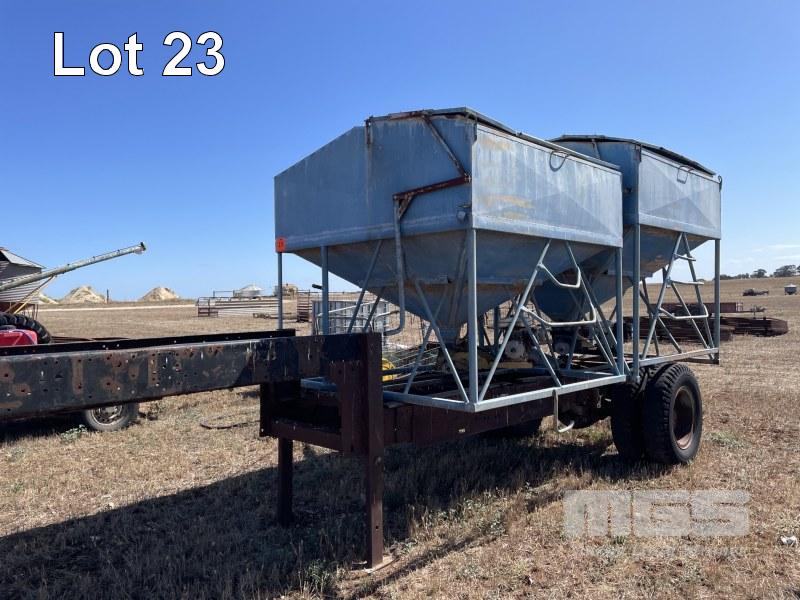 SUPER SEED UNIT COMPRISING 2 x SEED BINS WITH 4 & 6" AUGERS POWERED BY BELT DRIVE PETROL ENGINES ON GOOSE NECK SINGLE AXLE DROP DECK TRAILER, FABRICATED