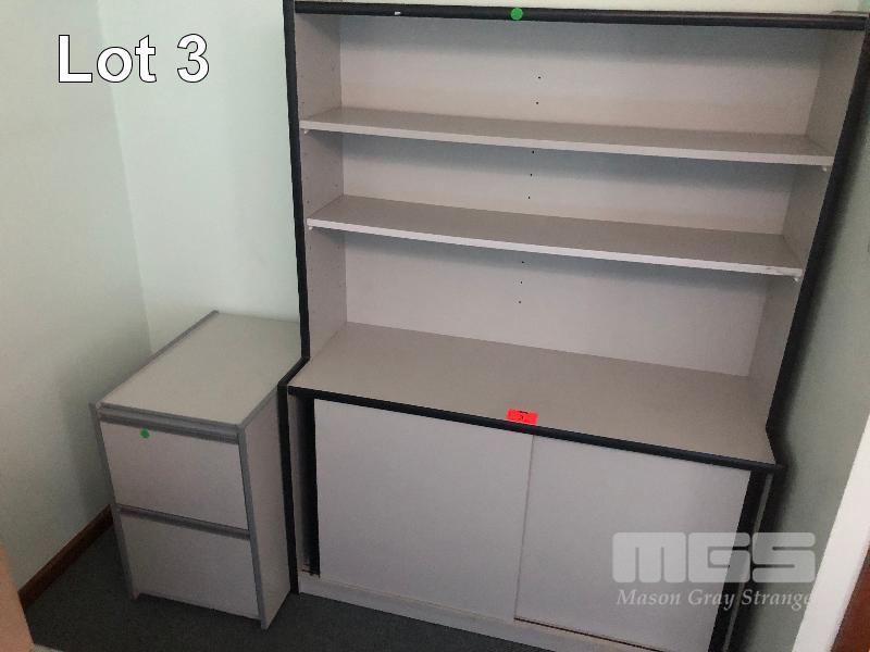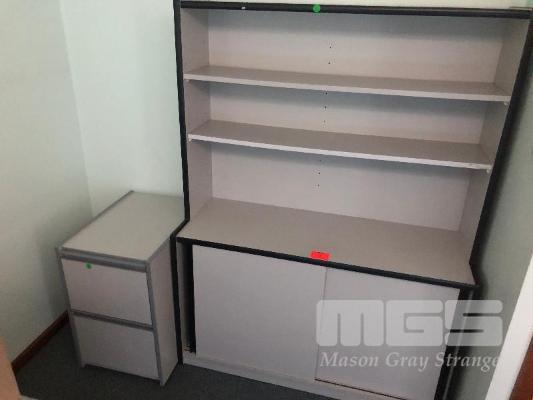 FILING CABINET, 2 DRAWER, GREY TIMBER LAMINATE PLUS MATCHING SIDE UNIT 2 DOOR 2 SHELF.
